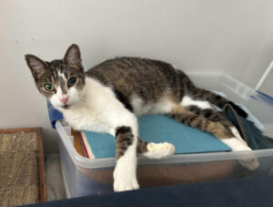 This is PAULA, an 8-year-old sweet and friendly black, brown & white DSH tabby female, recently rescued from outside. PAULA is very friendly, mellow, and loves attention.